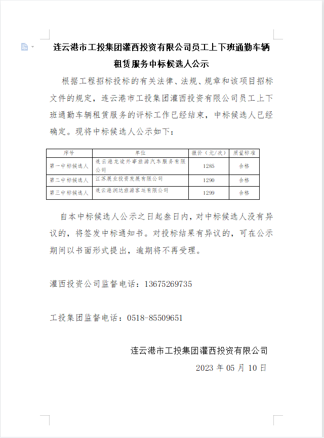 連云港市工投集團(tuán)灌西投資有限公司員工上下班通勤車(chē)輛租賃服務(wù)中標(biāo)候選人公示