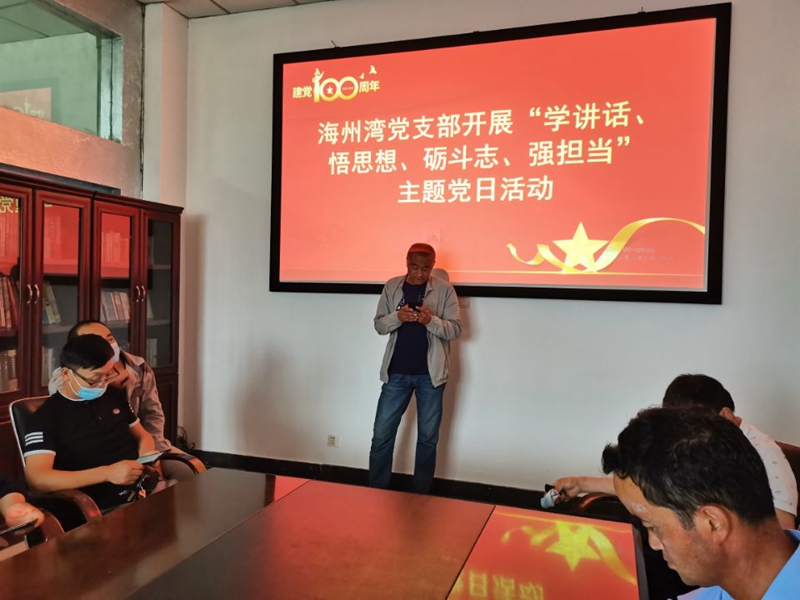 為深入學(xué)習(xí)貫徹習(xí)近平總書(shū)記“七一”重要講話精神,進(jìn)一步堅(jiān)定理想信念,引導(dǎo)廣大黨員不忘初心、爭(zhēng)創(chuàng)一流,7月27日上午,海州灣黨支部開(kāi)展“學(xué)講話、悟思想、礪斗志、強(qiáng)擔(dān)當(dāng)”主題黨日活動(dòng)。