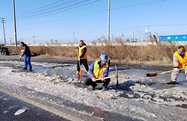 近期由于受冷空氣影響,氣溫低下,園區(qū)道路低洼積水處產(chǎn)生大面積結(jié)冰現(xiàn)象,如不及時(shí)清除,嚴(yán)重造成車(chē)輛側(cè)翻事故發(fā)生。道路排查現(xiàn)場(chǎng),管理人員及時(shí)與園區(qū)二班對(duì)接,聯(lián)合開(kāi)展“破冰保暢通”突擊活動(dòng)。大家各負(fù)其責(zé),齊心協(xié)力,揮動(dòng)手中鐵銑、羊鎬,經(jīng)過(guò)近4個(gè)多小時(shí)共同奮戰(zhàn),撬動(dòng)冰塊近400多塊,清理積水300多平方、20多處。