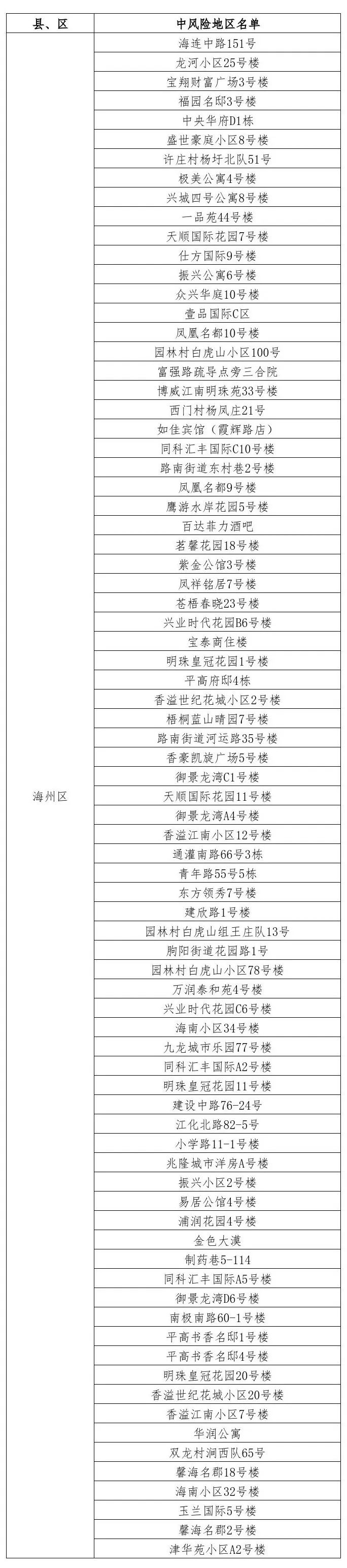 根據(jù)國(guó)務(wù)院聯(lián)防聯(lián)控機(jī)制有關(guān)規(guī)定,經(jīng)市指揮部研究決定,自發(fā)布之日起,對(duì)我市部分區(qū)域疫情風(fēng)險(xiǎn)等級(jí)進(jìn)行調(diào)整:海州區(qū)眾興華庭7號(hào)樓、悅城國(guó)際9號(hào)樓、香溢世紀(jì)花城小區(qū)7號(hào)樓、許莊村楊圩北隊(duì)75號(hào)、極美苑2號(hào)樓、頤和花園1號(hào)樓、麻紡小區(qū)10號(hào)樓、銀城公寓1號(hào)樓、新建西路30號(hào)樓、仕方國(guó)際10號(hào)樓、吾悅?cè)A府9號(hào)樓由中風(fēng)險(xiǎn)地區(qū)調(diào)整為低風(fēng)險(xiǎn)地區(qū)。其他地區(qū)風(fēng)險(xiǎn)等級(jí)不變。調(diào)整后全市現(xiàn)有79個(gè)中風(fēng)險(xiǎn)地區(qū)。