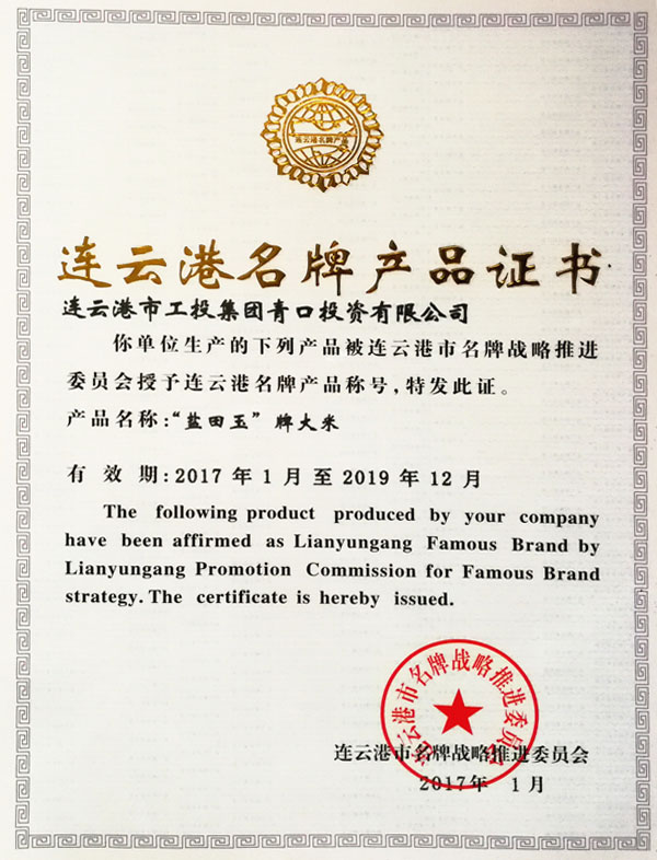 ? ? ? ? 近日,我公司“鹽田玉”品牌大米經(jīng)過連云港市名牌戰(zhàn)略推進委員會審議,被授予2017-2019年度“連云港名牌”稱號。這是米業(yè)營銷中心對“鹽田玉”品牌創(chuàng)建的又一重大突破,也為下一步大米營銷工作打下堅實的品牌基礎。(王踴)